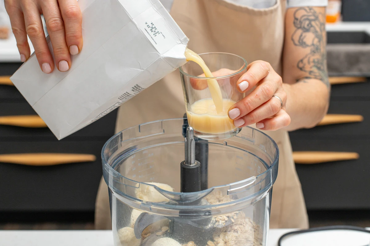 Высыпьте овсяные хлопья в чашу кухонного комбайна или блендера. Банан почистите, поломайте на кусочки и добавьте к овсянке.