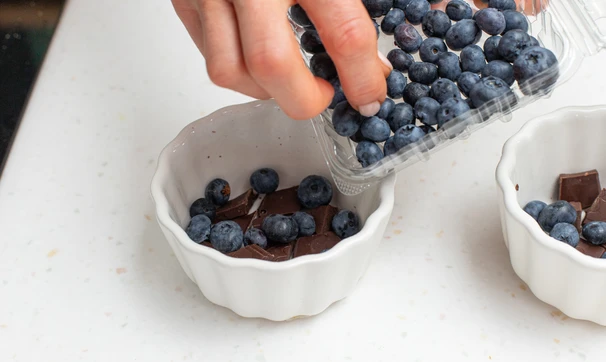 Смажьте маслом формы для запекания (мы использовали две). На дно каждой выложите по 50 г шоколада и около по 30 г голубики.