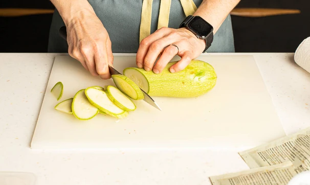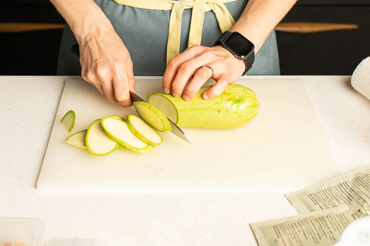 Шампиньоны нарежьте ломтиками, кабачки — кружочками наискосок, чеснок измельчите.