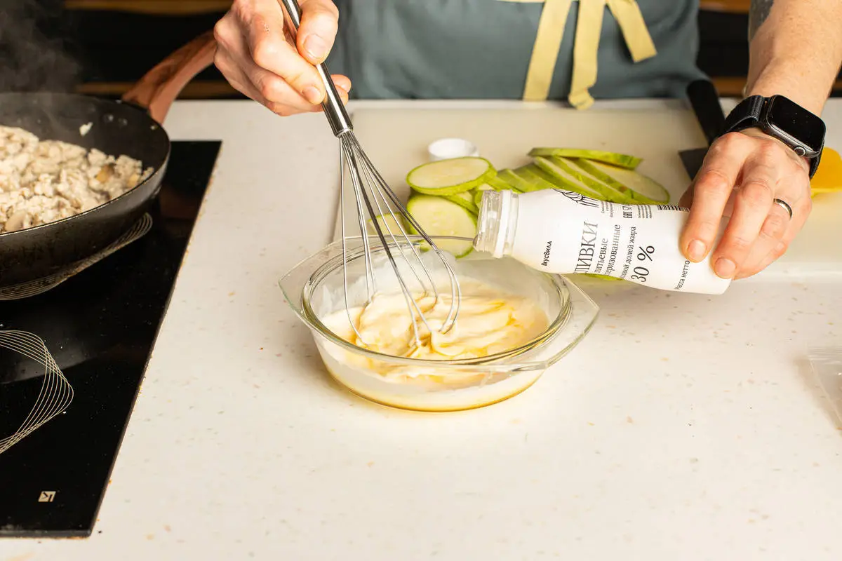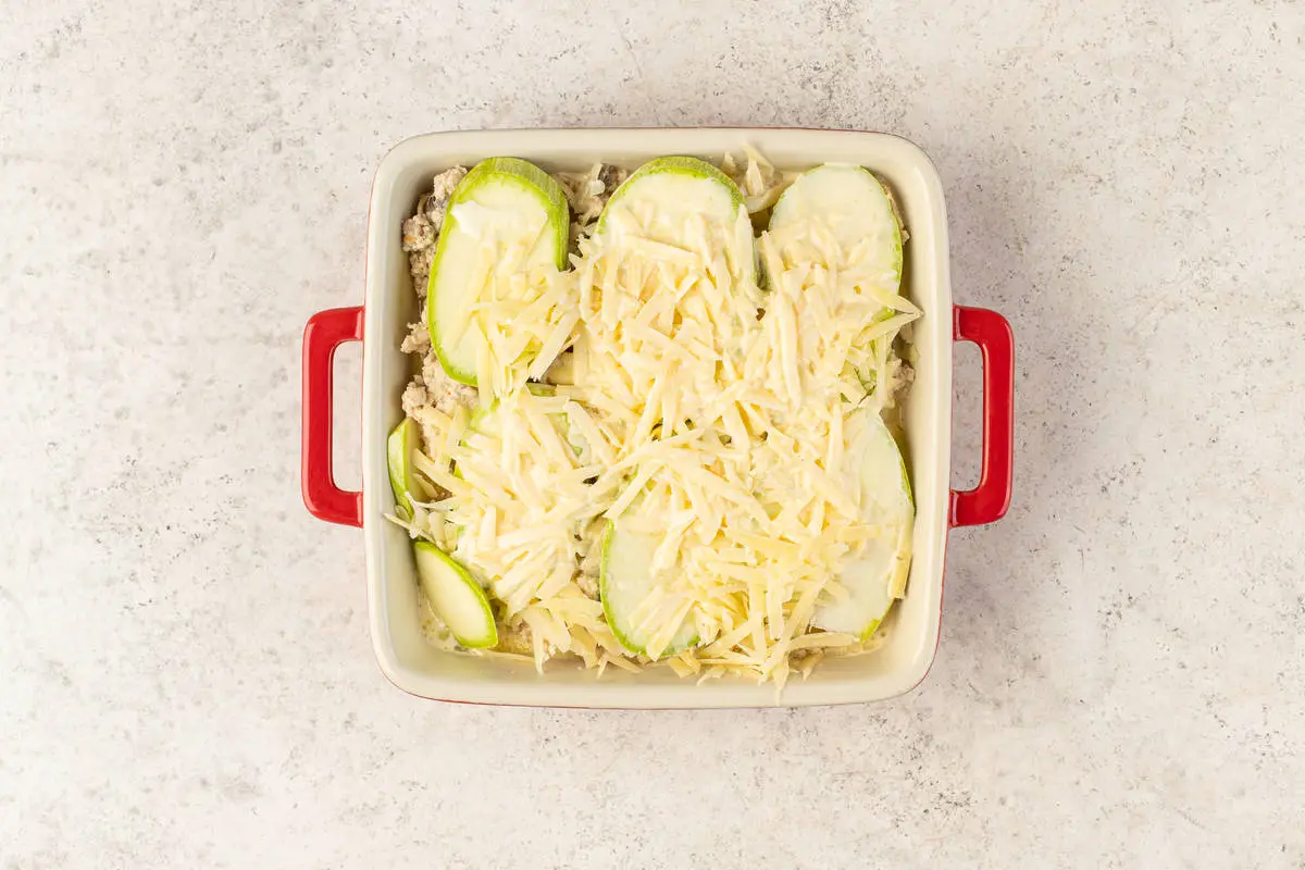 Чередуйте, пока не заполните форму, верхний слой кабачков залейте сливками и посыпьте тёртым сыром.