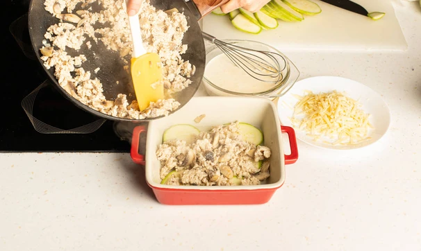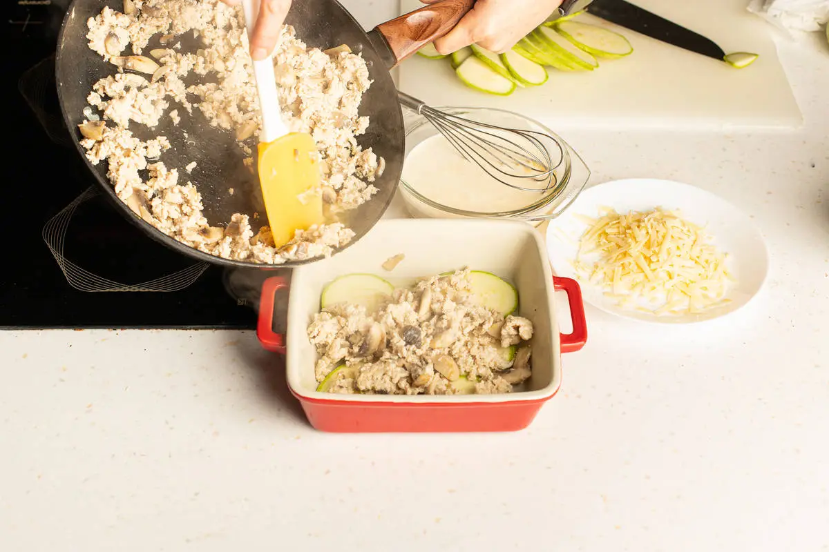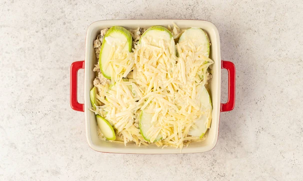 В форму для запекания выложите кабачки, сверху фарш и снова кабачки.