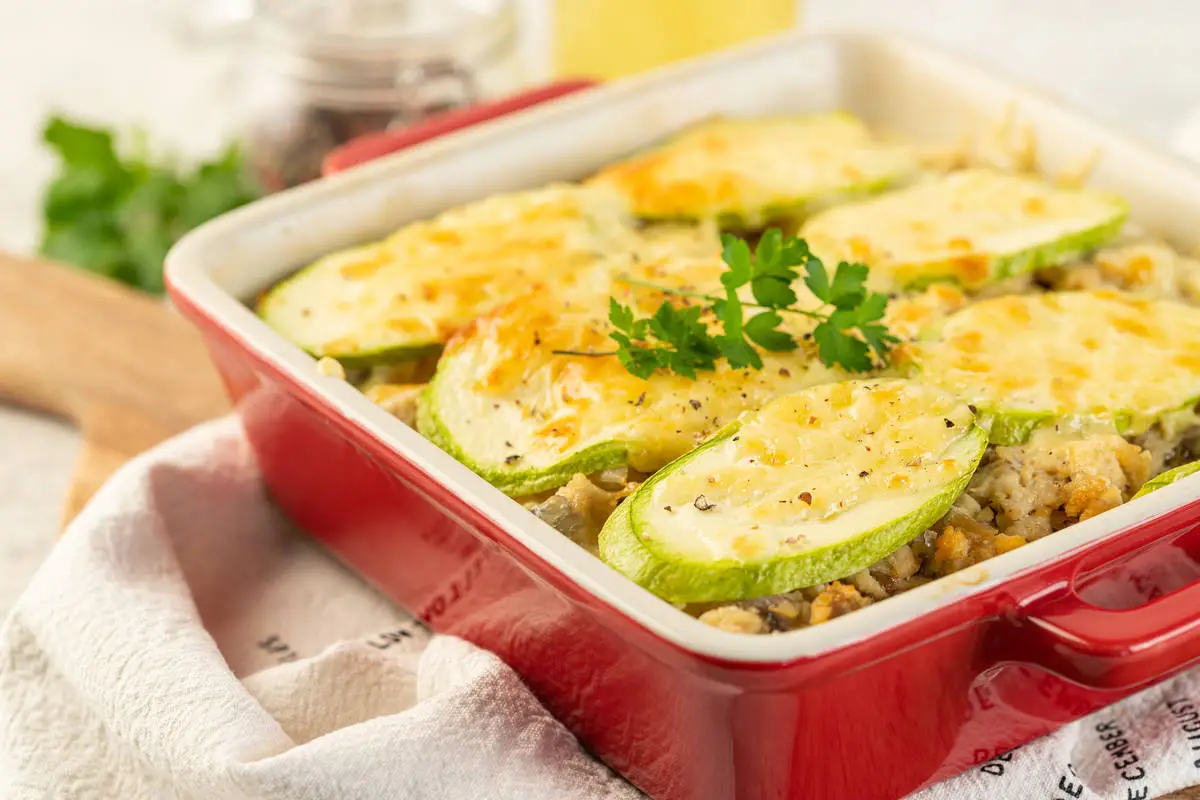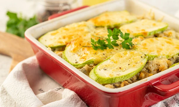 Очень нежный куриный фарш в сливках и чуть хрустящие молодые кабачки под сырной корочкой — отличный летний обед.