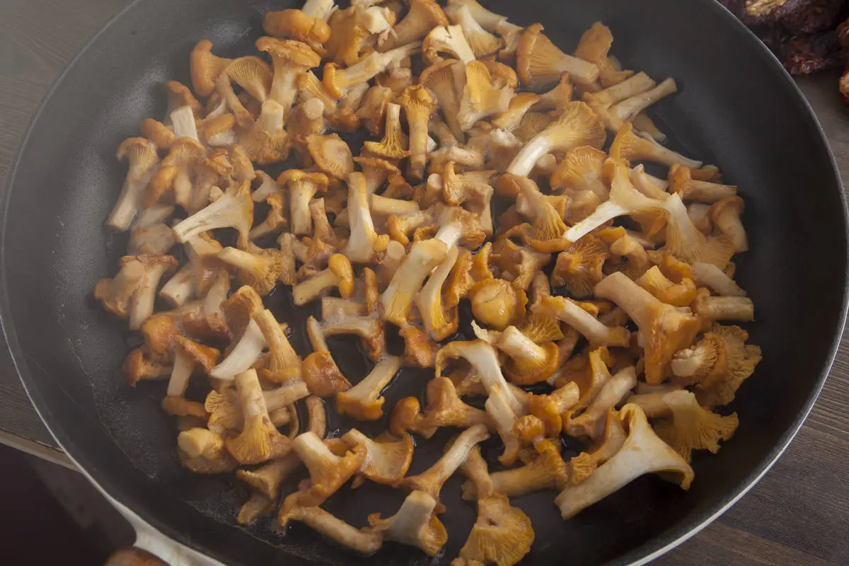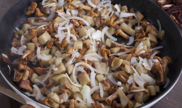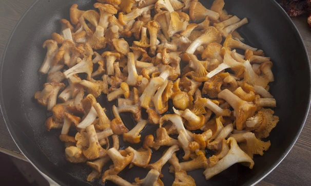 Лисички переберите, быстро промойте, крупные разрежьте на 2-3 части, выложите в сковороду, когда вся жидкость выпарится, добавьте топленое масло.