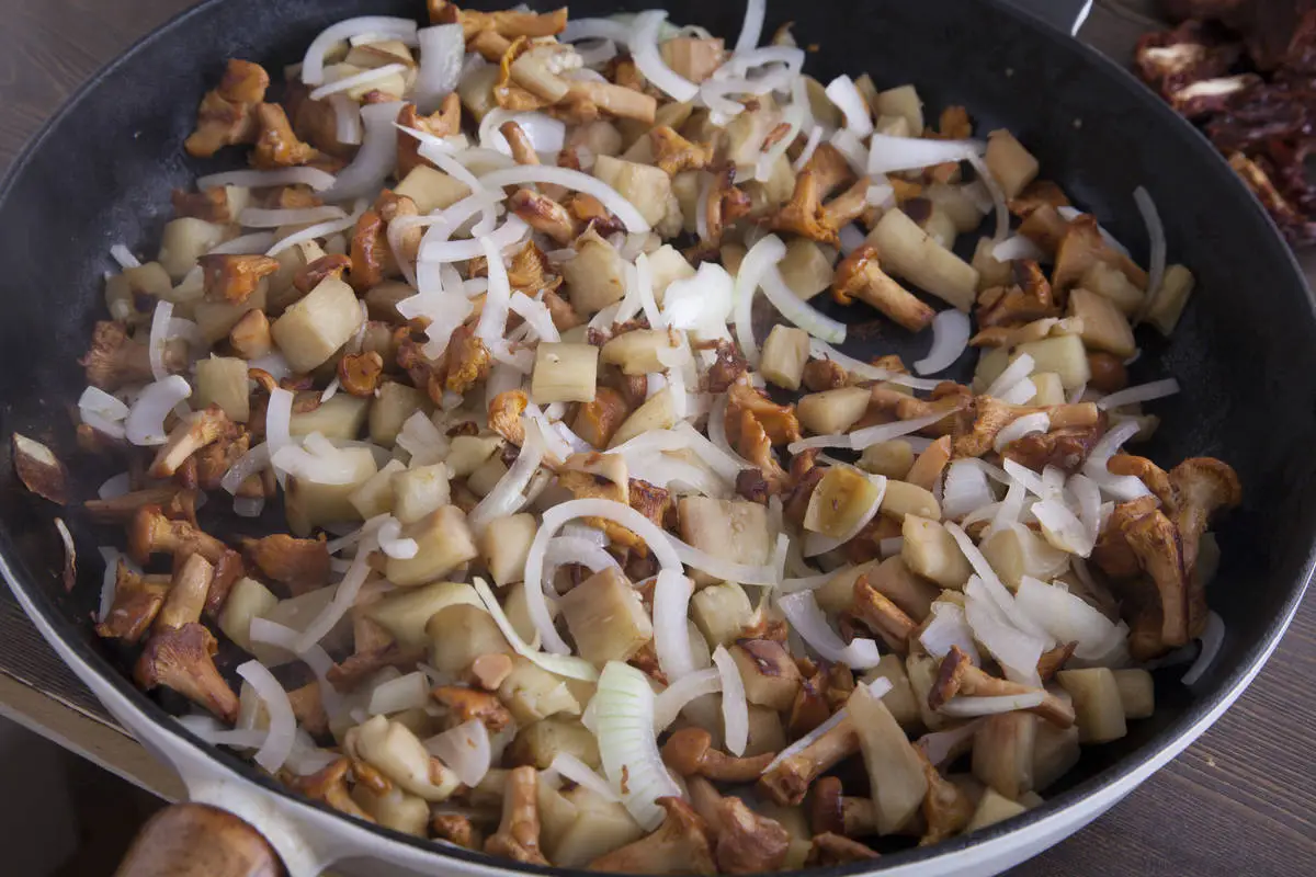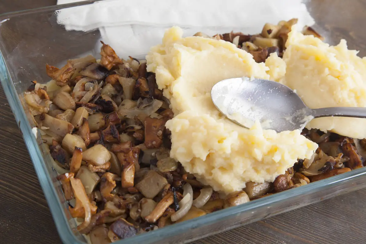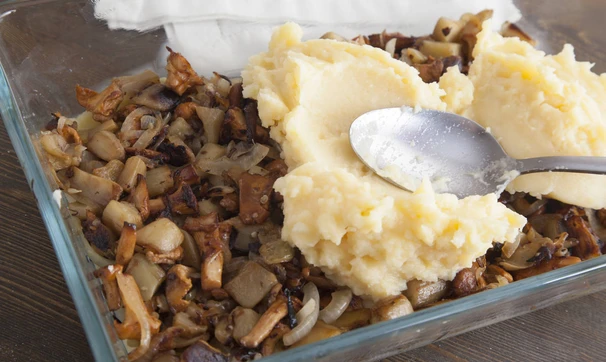 В форму для запекания выложите половину картофельного пюре, затем лисички с баклажанами, сверху оставшееся пюре, посыпьте тертым сыром и запекайте в духовке при 180 С до румяной корочки. Приятного аппетита!