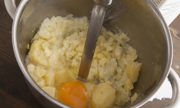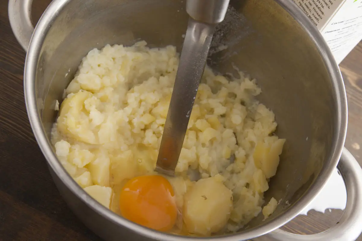 Готовый картофель разомните толкушкой в пюре с добавлением яйца и молока, посолите.
