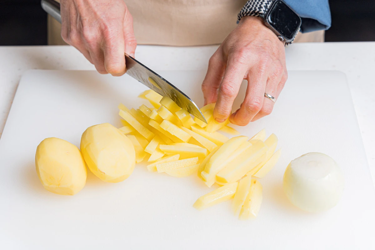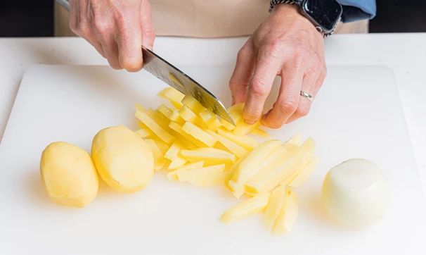 Помойте и почистите картофель и лук. Картофель нарежьте брусочками.