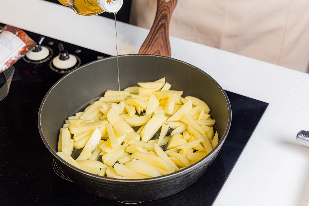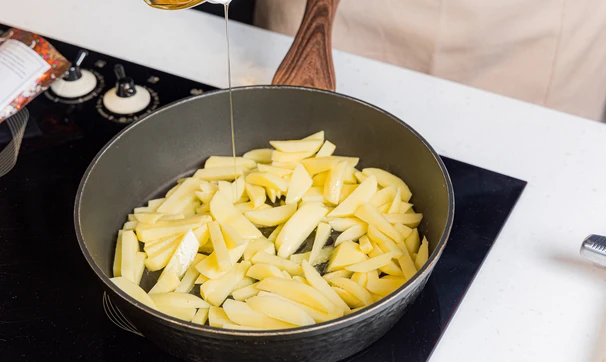 Разогрейте сковороду с растительным маслом, выложите картофель и готовьте на среднем огне, периодически помешивая, 15-25 минут (зависит от сорта картофеля и размера брусочков) — картошка должна быть ещё сыровата, но почти готова.