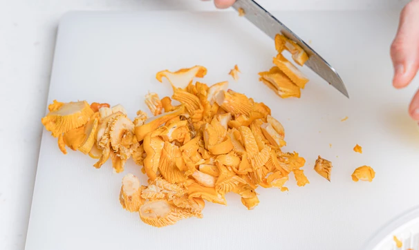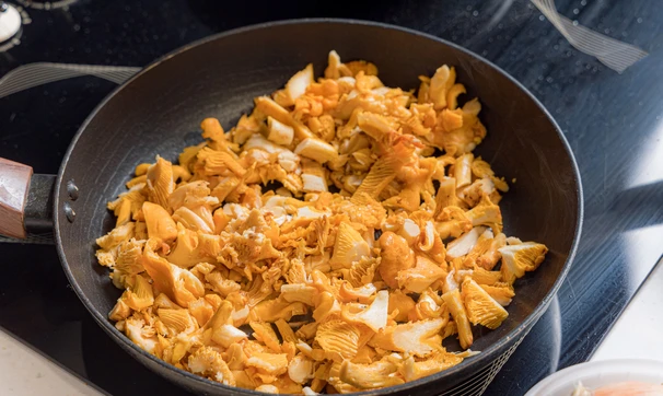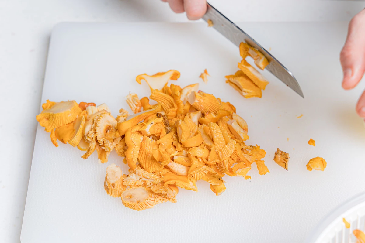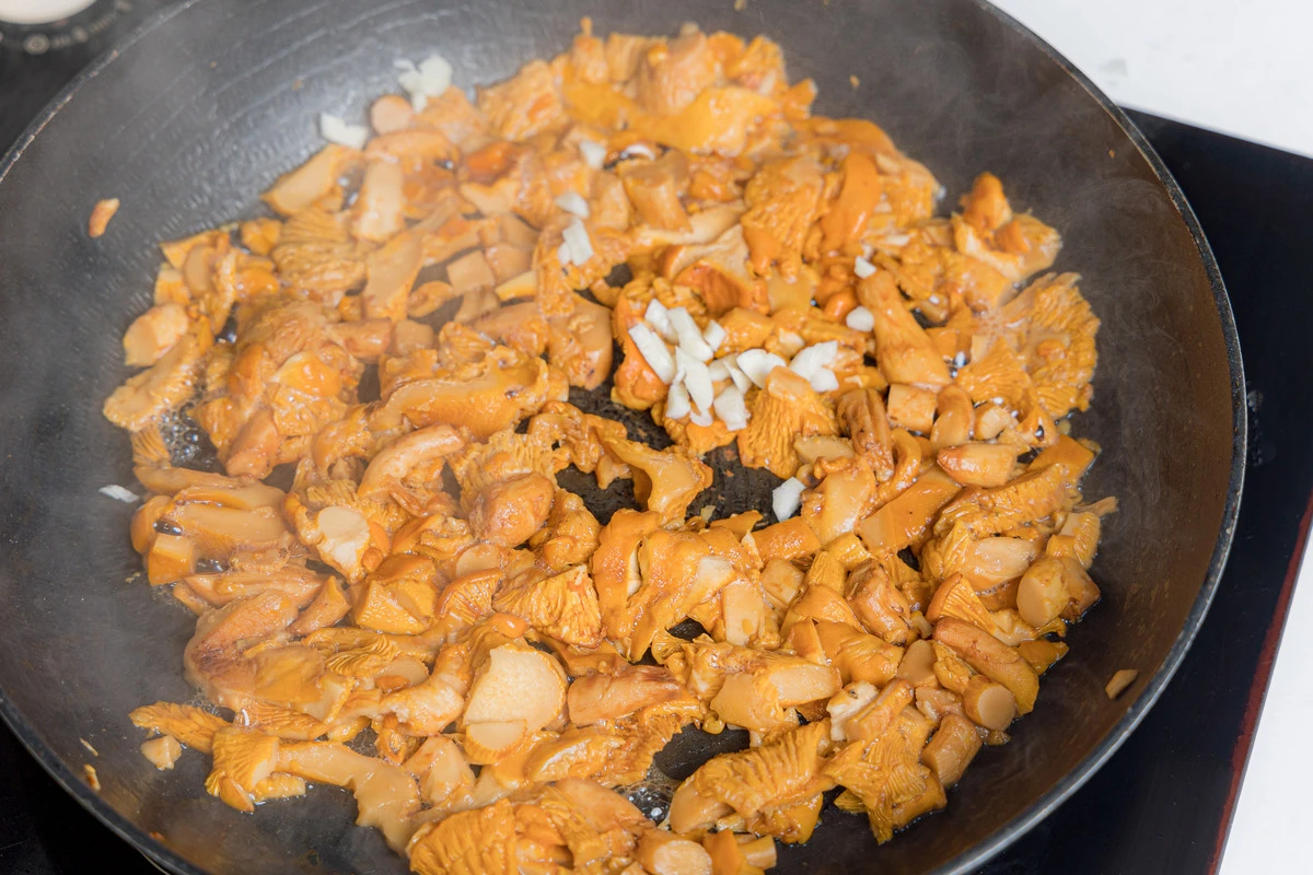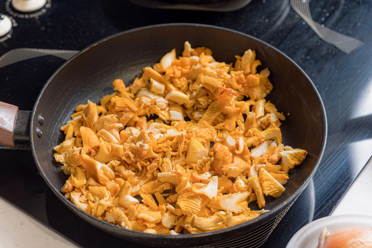 Лисички очистите от случайного мусора. Если грибы грязные, то промойте и просушите. Нарежьте произвольно — например, кусочками среднего размера. Разогрейте сковороду, выложите грибы и готовьте ориентировочно 15 минут на среднем огне, периодически помешивая, пока не выпарится вода.