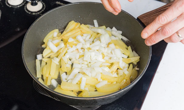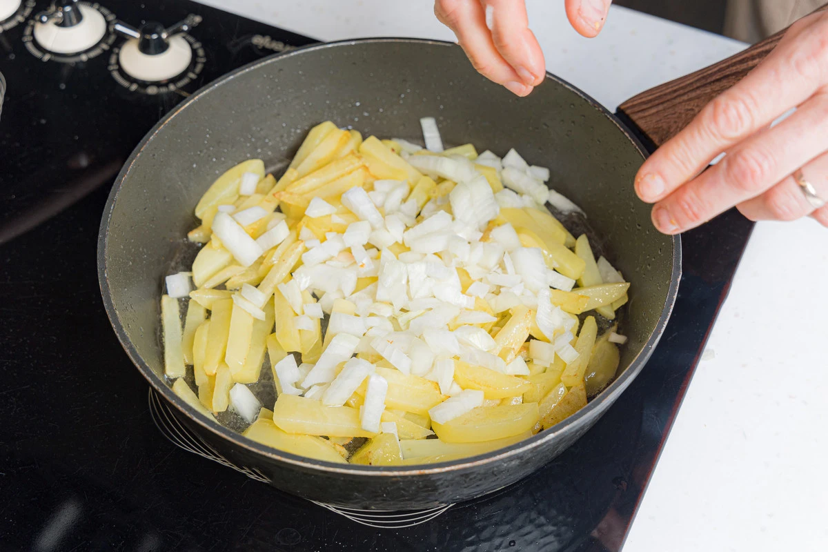 Лук нарежьте кубиками среднего размера, добавьте к картошке через 15 минут после начала жарки. Готовьте на среднем огне, периодически помешивая, примерно 10 минут, пока не прожарится лук.