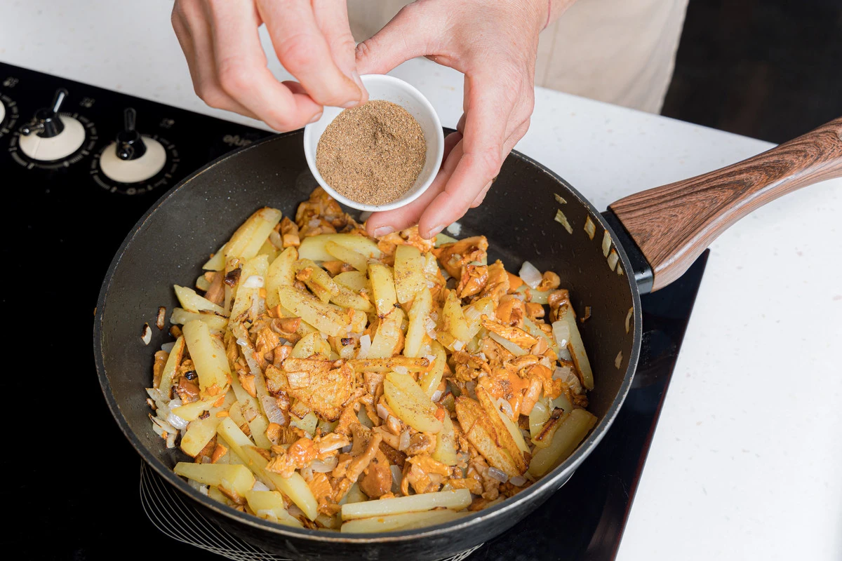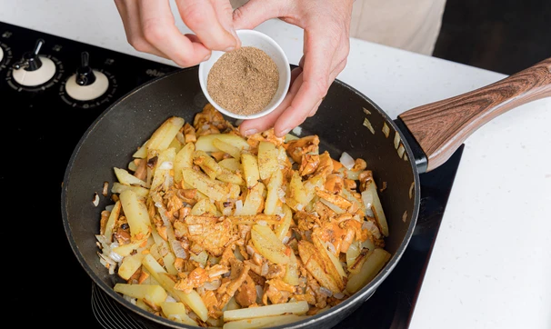 Добавьте грибы в картошку с луком, посолите, поперчите, добавьте щепотку кориандра — он лучше раскрывает вкус грибов. Перемешайте.