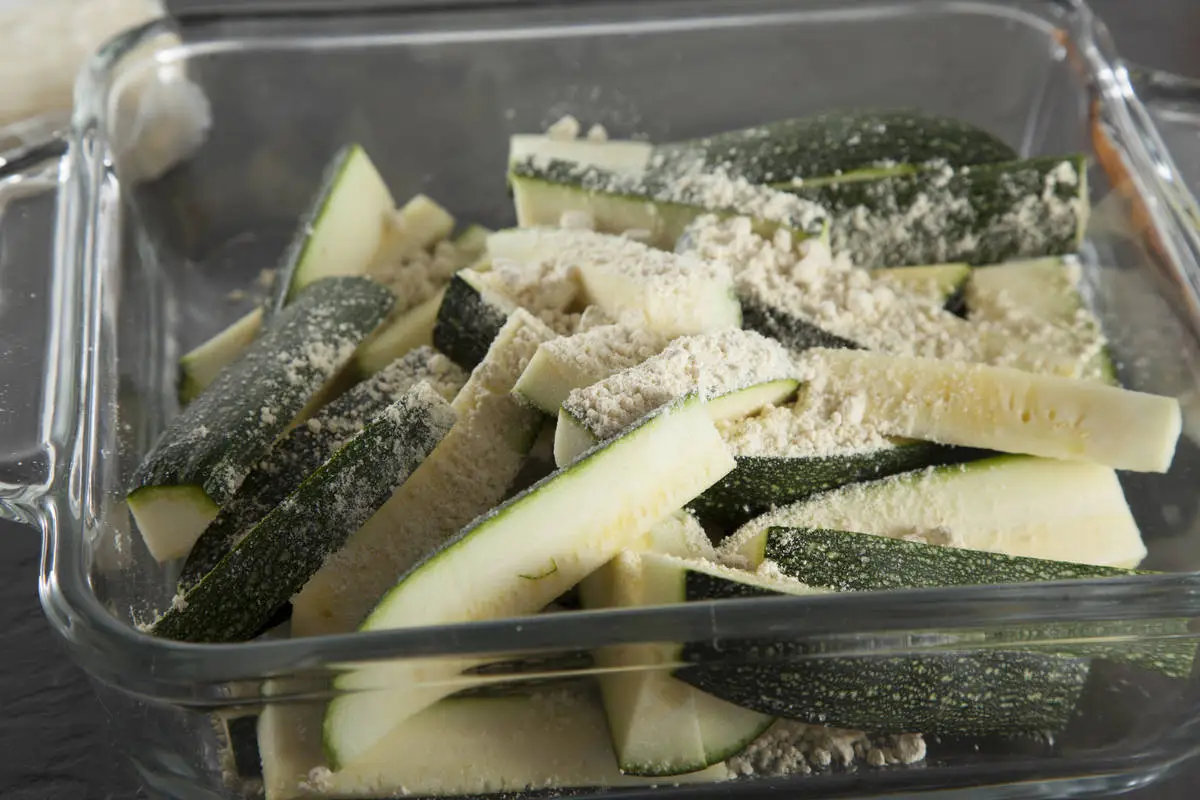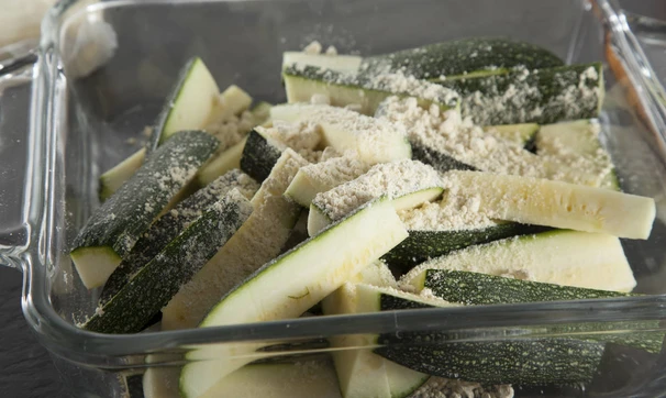 Цукини порежьте брусочками, обваляйте в муке, посолите и выложите на противень. Запекайте в духовом шкафу при 180 градусов около 10 минут.