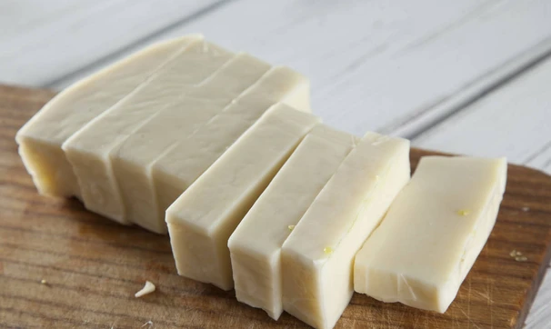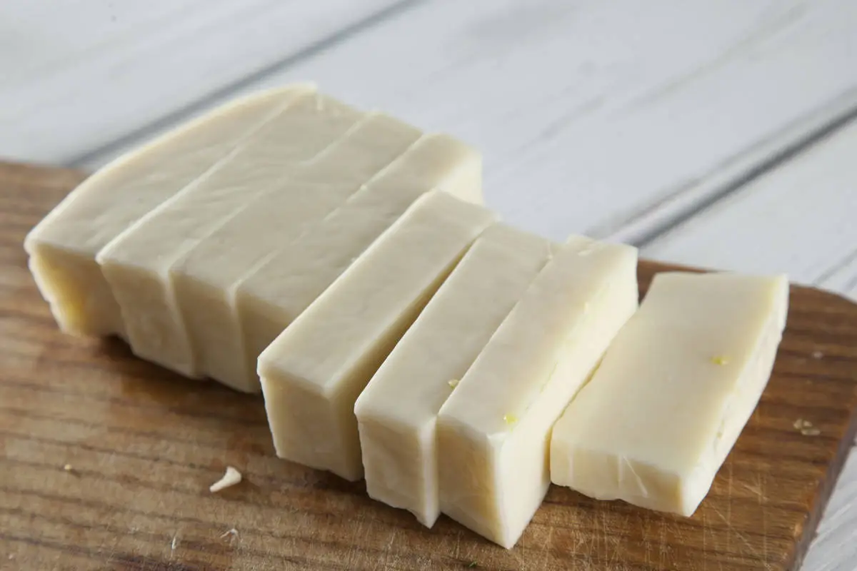 Халумис порежьте кусочками толщиной около 1 см и обжарьте на оливковом масле до золотистой корочки с обеих сторон.