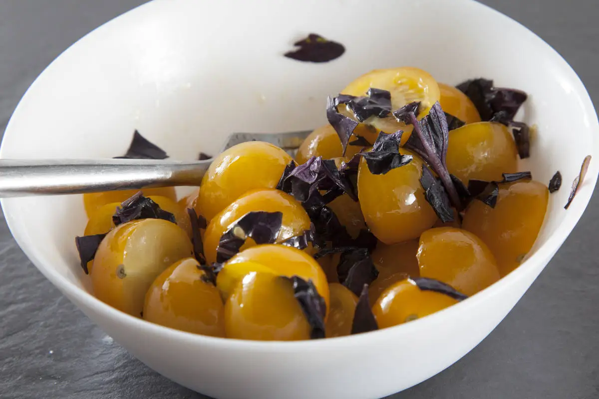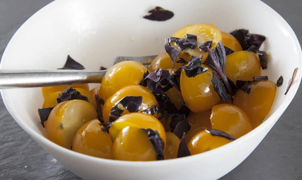 Томаты черри порежьте половинками, посолите, нарвите листики базилика, перемешайте.