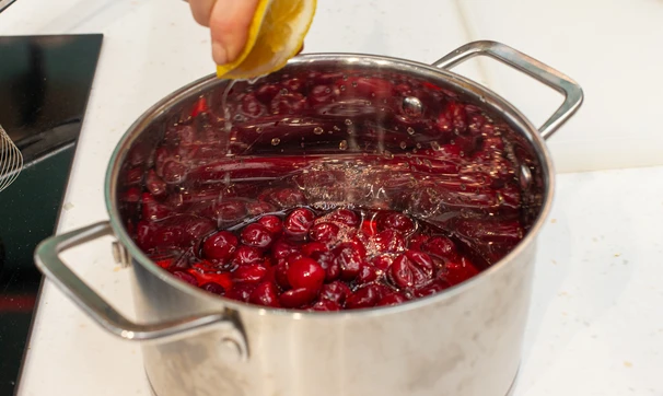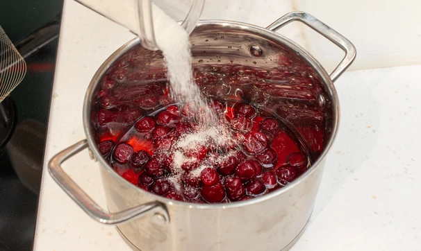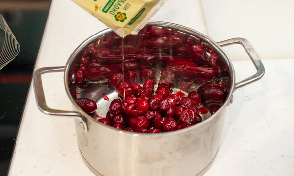 Добавьте 2-3 ст. л. сахара (или по вкусу). Перемешайте всё, доведите до кипения, снимите с плиты и процедите. Вишню сохраните.