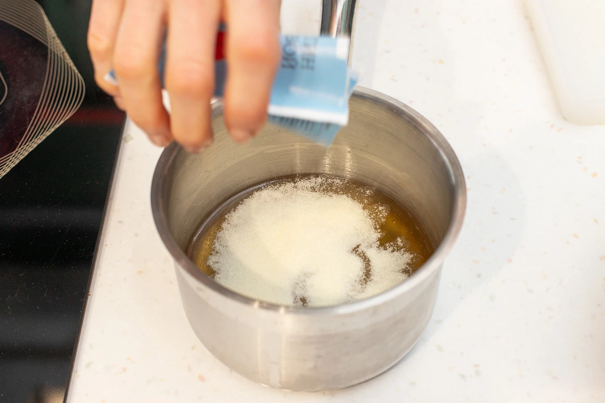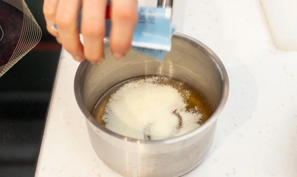 В другую небольшую кастрюлю или ковш налейте ещё 200 мл сока. Разогрейте, чтобы пошёл пар, но до кипения не доводите. Добавьте желатин, размешайте венчиком до полного растворения.