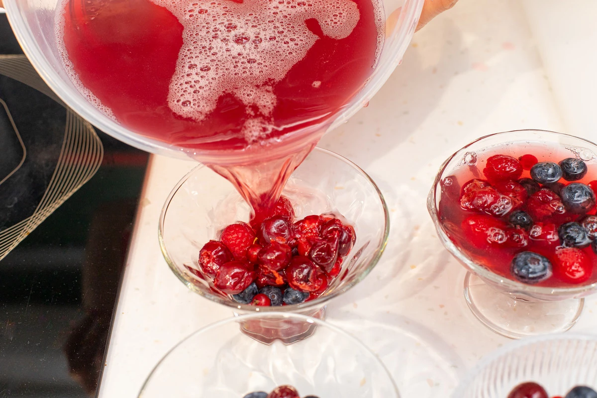 Свежие ягоды помойте и обсушите. Можете брать любые по вкусу, мы взяли малину, голубику и красную смородину. Разложите ягодное ассорти по креманкам или небольшим стаканам, добавьте вишню, которую ранее прогревали. Залейте подготовленным ранее вишнёво-яблочным соком с желатином и уберите в холодильник до застывания минимум на 4-5 часов.